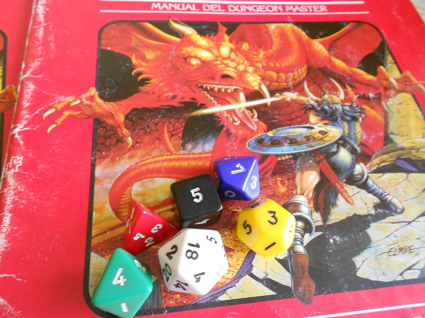 Pero vamos al turrón. Mis dados míticos son los Seis Legendarios, los dados que venían en la Caja Roja de Dalmau que me regalaron allá por 1985. Y aunque hoy día tengo un montón de dados soy perfectamente capaz de encontrarlos, aunque no sean de lo más vistosos. Pero tengo sus formas y colores grabados a fuego en mi memoria.