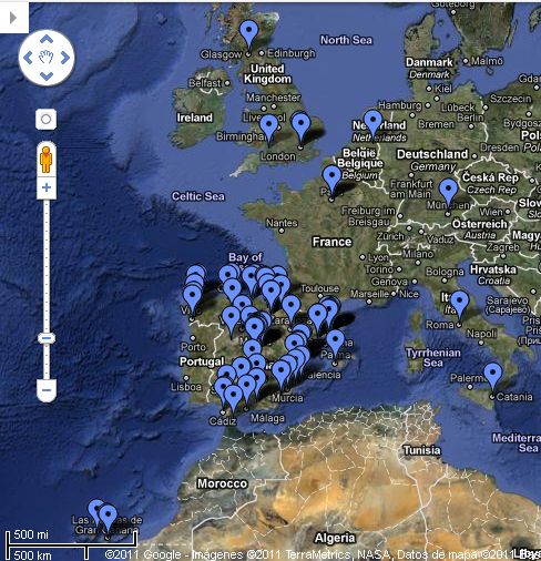 El mapa, a la hora de publicar esta entrada. Como veis hay también fichados sitios fuera de España… ¡incluso hay uno en Japón! Aunque claro, no sale en la foto.