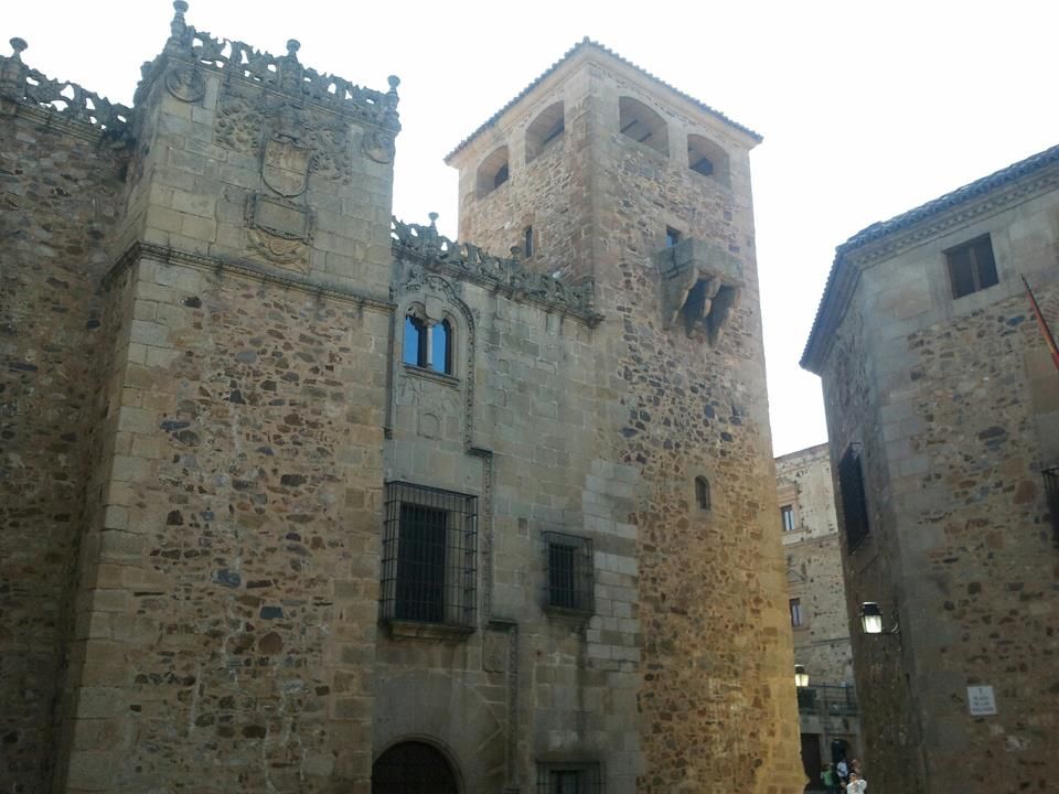Pues bien, en el siglo XIV prácticamente todas las casas nobles de Cáceres decidieron ponerse a levantar palacios fortificados dentro de las murallas de la ciudad. Y con «fortificados» no me refiero a unas rejas en las ventanas y unos simples portones reforzados, qué va. Hablo de plantas bajas con paredes de dos (2) metros de grosor, balcones con matacanes sobre las puertas principales y torres almenadas con aspilleras para disparar saetas sobre las calles y plazas aledañas. Al loro: